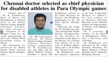 Press Release on being selected as "Lead Medical – Indian Delegation" for Special Olympics – World Winter Games, to be held on 22nd to 28th January at Kazan, Russia.